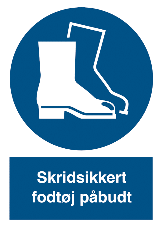 Skridsikkert fodtøj påbudt Nogle virksomheder har meget glatte gulve med risiko for at falde. Skridsikkert fodtøj kan her være yderst vigtigt. Man bør tage påbudsskilte i brug her for at sikre, at alle medarbejdere går med skridsikkert fodtøj, i de glatte